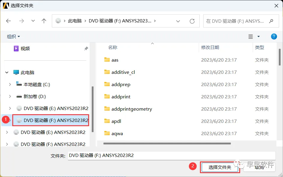 38、点击左侧的【DVD驱动器(F:)】,再点击【选择文件夹】