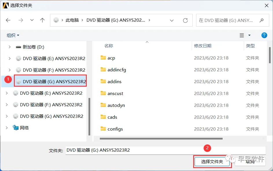 43、点击左侧的【DVD驱动器(G:)】,再点击【选择文件夹】