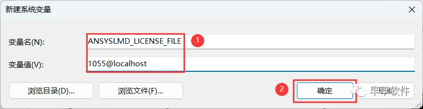 55、变量名输入:ANSYSLMD_LICENSE_FILE;变量值输入:1055@localhost,再点击【确定】