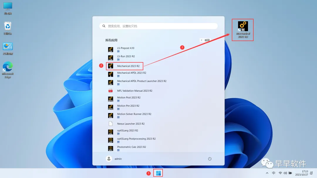 58、回到桌面,点击任务栏的【开始菜单】,在【所有应用】中找到【Mechanical 2023 R2软件图标】,将软件图标拖到桌面上,完成软件桌面快捷方式的创建