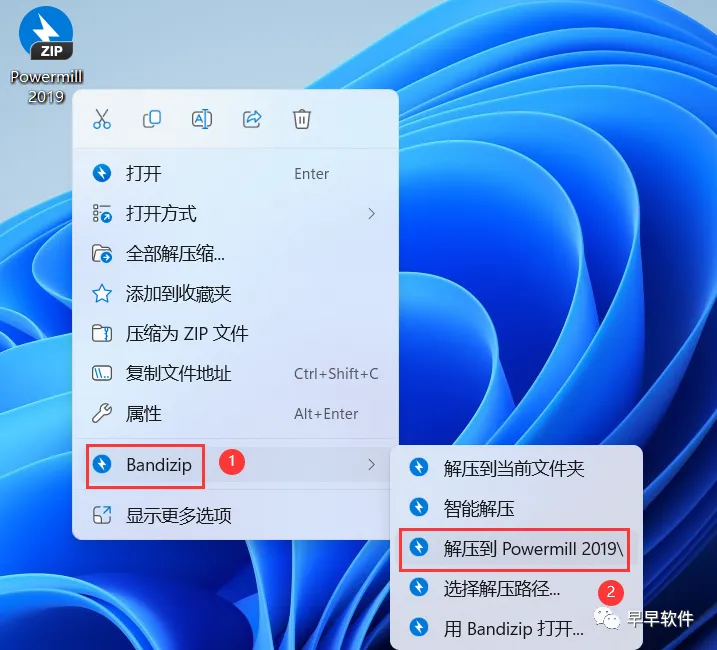 1、下载PowerMill 2019软件安装包到电脑上,右键选择【解压到PowerMill 2019\】