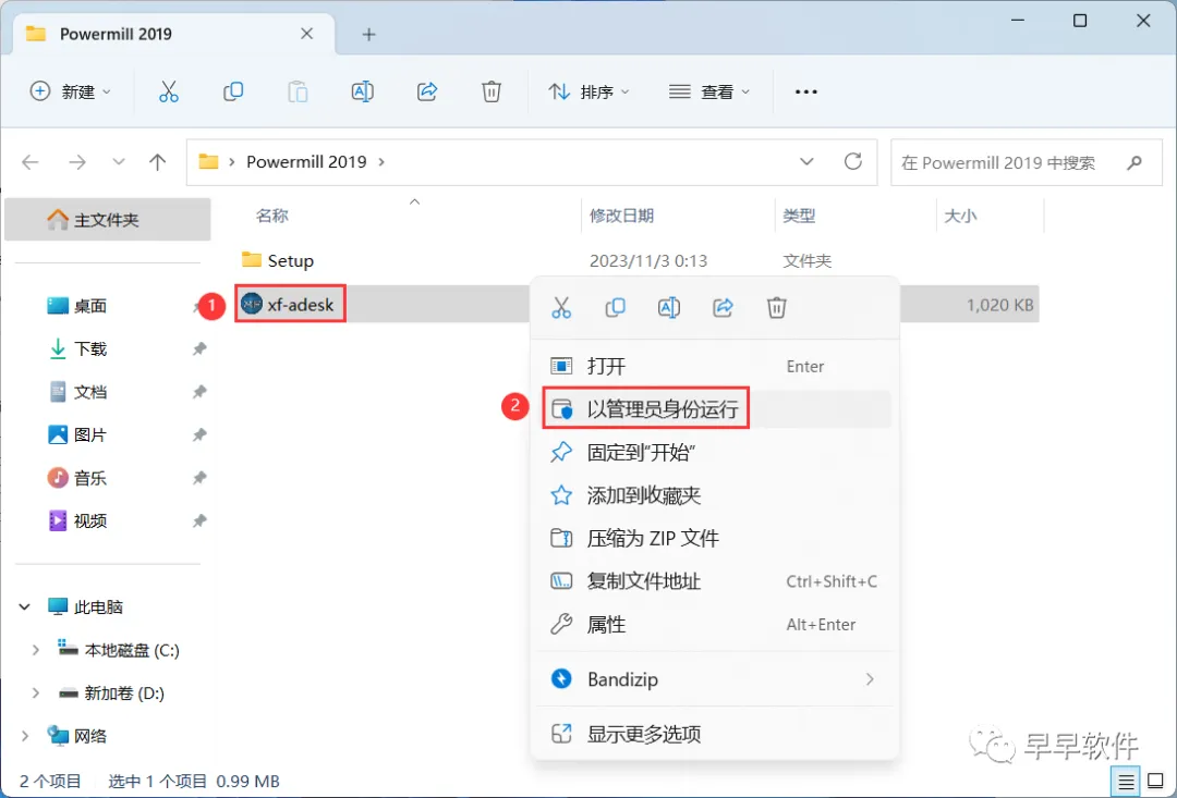 20、回到PowerMill 2019文件夹,找到【xf-adesk】程序,右键选择【以管理员身份运行】它
