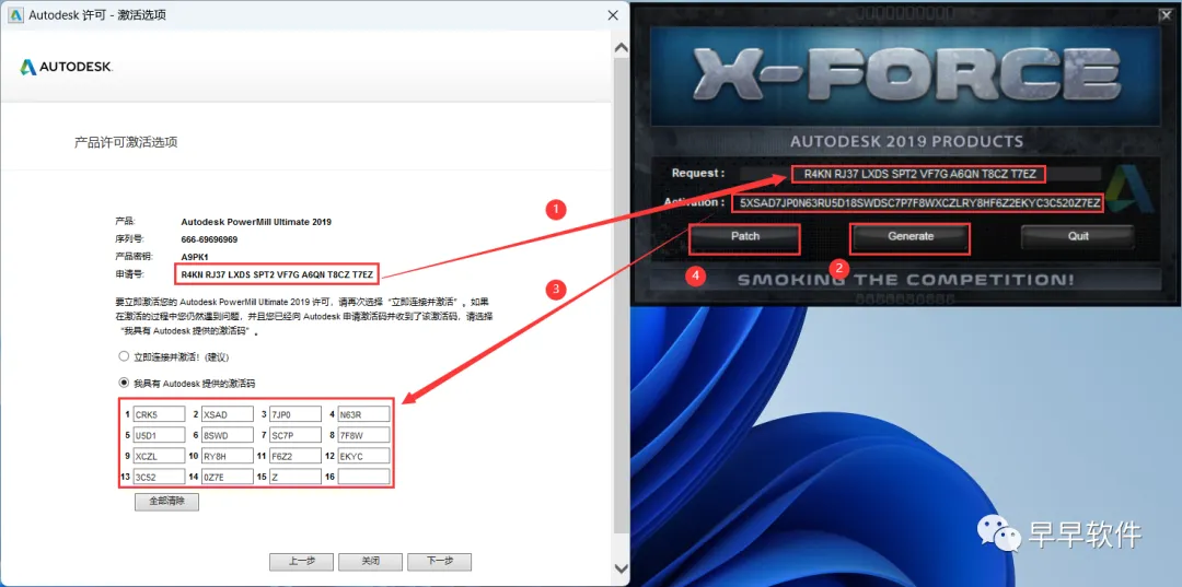 21、打开软件界面,将软件的【申请号】填入到程序的【Requset】内,再点击【Generate】,将程序的【Activation】填入到软件的【激活码】内,再点击【Patch】