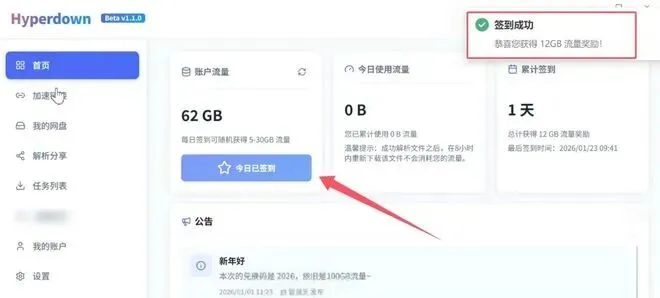 登录成功后软件会赠送50GB的流量,并且每日签到还会赠送额外的5-30GB的流量,这些流量都可以累积的,把这些流量用于网盘下载对于普通用户来说完全够用了,所以基本上是实现了软件白嫖。