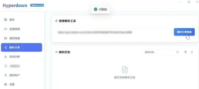 接着在解析分享中把需要下载的度娘分享链接粘贴进去,并进行解析。