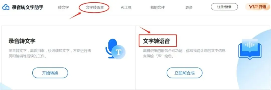在搜索引擎内输入“录音转文字助手“,点击搜索,即可找到官方网站。点击网站首页顶部菜单栏的第二个 “文字转语音”(或者页面右边“文字转语音”下面的“立即AI合成”按钮)即可进入“在线文字转语音”界面。如下图所示。