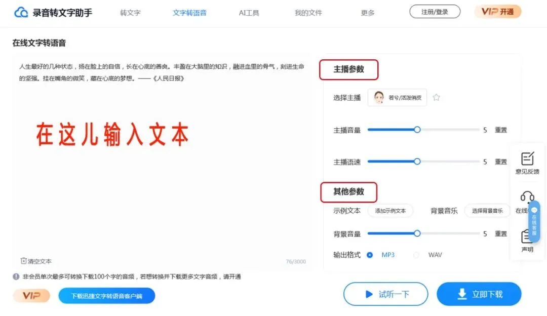 左下角有段文字提示:“非会员单次最多可转换下载100个字的音频,若想转换并下载更多文字音频,请开通VIP“。注意这儿指的是“单次”,当然你可以多次重复操作哦!这对于一般用户已经足够,也是很友好的了。