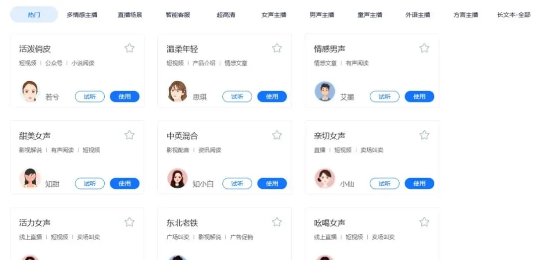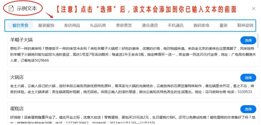 示例文本丰富多彩,适配不同场景,可以修改套用。最好在自己没有粘贴文本时试听操作,否则点击“选择”后会直接添加在你已粘贴的文本之前的。