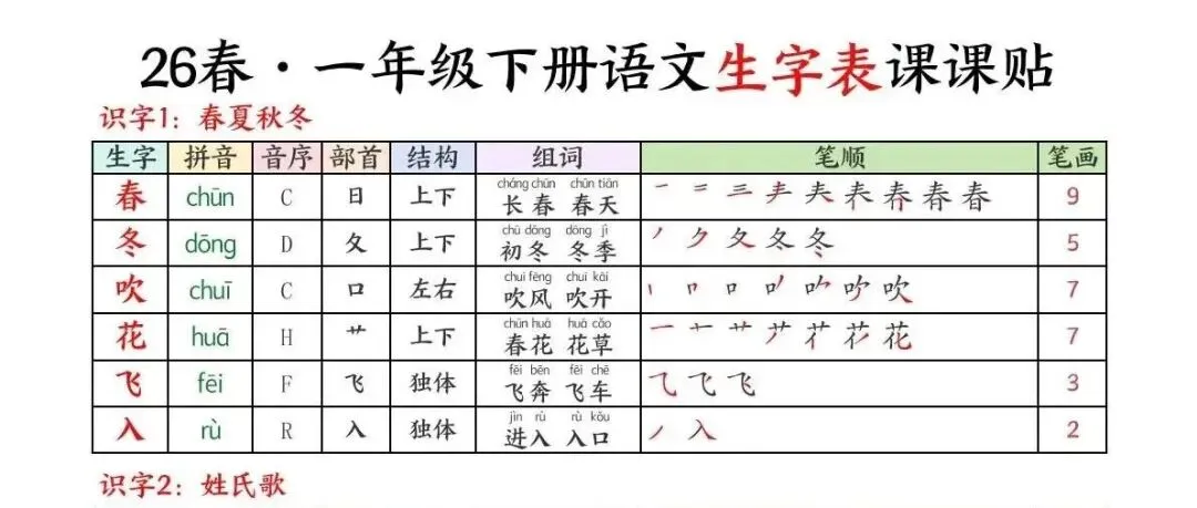 新学期即将开始,为一年级小朋友精心准备了2026年春下册语文生字表课课贴电子版资源。这份资料按照课文顺序编排,方便学生课前预习和课后复习,是语文学习的得力助手。