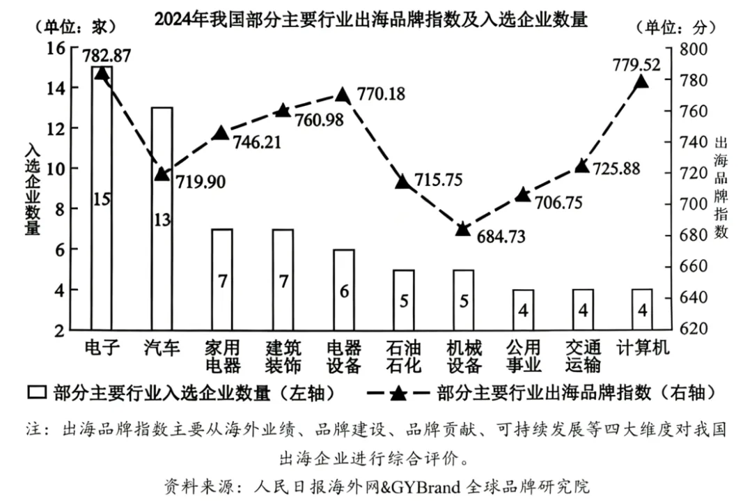 11.近年来,我国各行业龙头企业积极“走出去”,通过极具含金量的商品、服务与技术,不断融入全球价值链,加速开拓海外市场。2024年,我国出海品牌指数100强平均得分为746.89分(满分1000分)。结合下图,可推断出( )