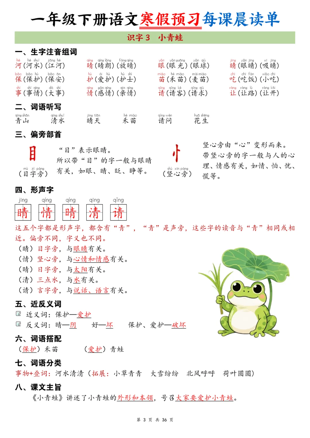 【免费下载】一年级(下)语文 26版新寒假预习每课晨读单