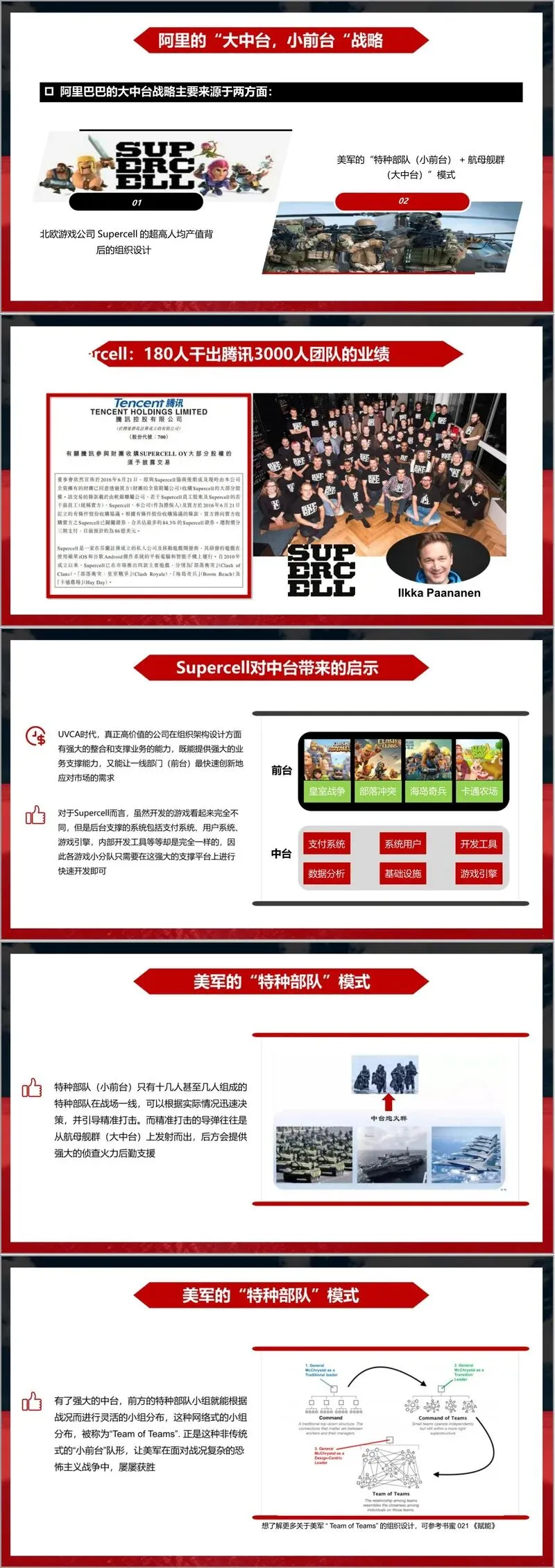 阿里 “大中台,小前台” 战略的提出并非偶然,其灵感源于美军 “特种部队 + 航母舰群” 的作战模式与北欧游戏公司 Supercell 的组织设计。美军以小股特种部队作为前台快速响应战场变化,依托航母舰群提供的强大火力与后勤支援完成精准打击;Supercell 则通过共享后台支撑系统,让小团队聚焦游戏创新,实现了超高人均产值。阿里将这一理念落地,打破了传统 “单项目单平台” 的分散模式,将天猫、支付宝、聚划算等前台业务的共性能力沉淀为用户中心、商品中心、交易中心等中台模块,为前台提供标准化、可复用的服务支持,既保障了业务灵活性,又避免了重复建设。