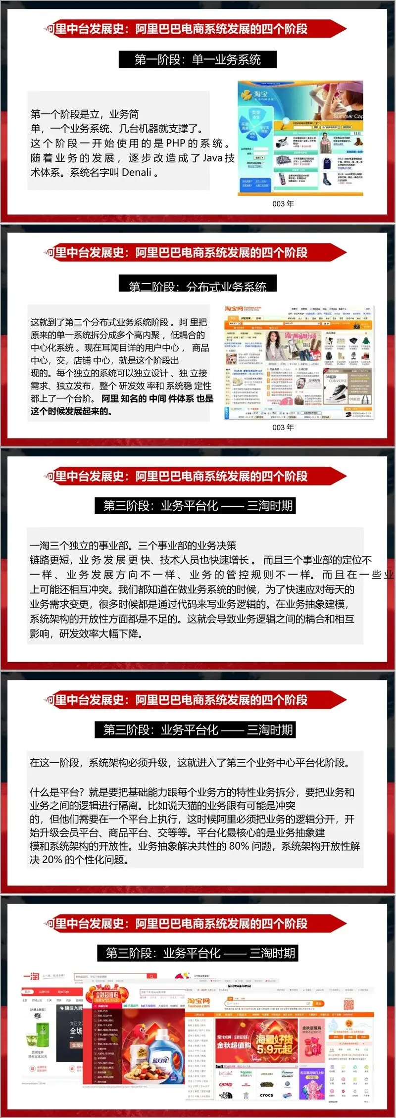 阿里电商系统的发展历程见证了中台的演进轨迹,共经历四个阶段:第一阶段为单一业务系统,以PHP 技术支撑早期简单业务;第二阶段进入分布式业务系统,拆分出用户中心、商品中心等独立模块,提升研发效率与系统稳定性;第三阶段为业务平台化,面对淘宝、天猫、一淘等多业务线的差异与冲突,通过业务抽象建模与架构开放,实现基础能力与个性化业务的分离;第四阶段则是业务中台化,解决了跨领域协作成本高、信息获取难、低水平重复建设等问题,通过构建运营平台、统一业务身份标识,实现了业务全生命周期的可视化与智能化管理。