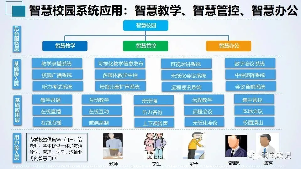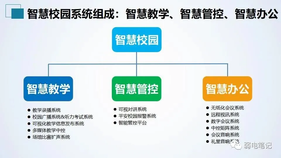 本方案中智慧校园系统组成:智慧教学、智慧管控、智慧办公