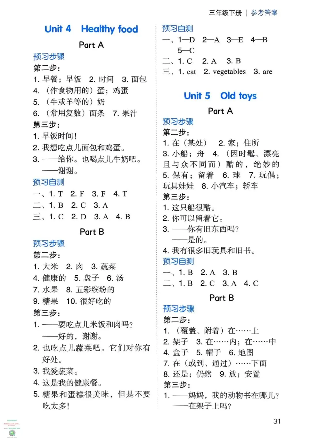 ●人教PEP新教材三年级英语下册Unit1课本翻译笔记,全册可下载