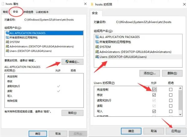 4、遇到输入#后无法保存,需要右键host的属性,选择安全-编辑-勾选完全控制的“允许”,点击应用即可重新保存host