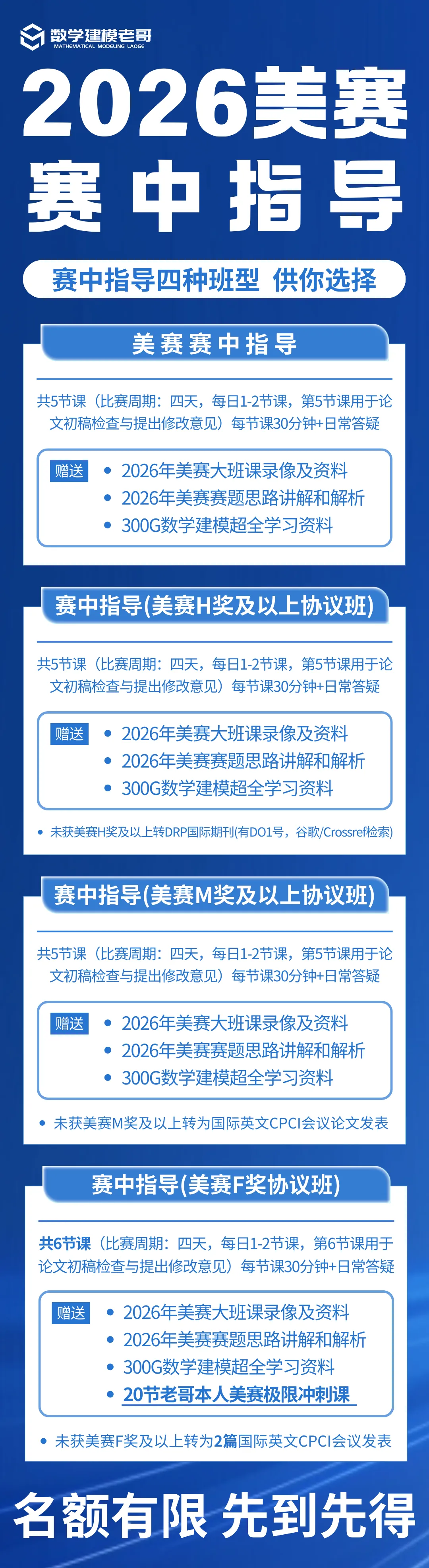 想拿奖的小伙伴们看过来,老哥作为数模行业top级的存在,推出了2026美赛赛中指导业务,在历年基础上,服务更加精进,师资更加雄厚,已经帮助千名小伙伴拿到大奖。名额有限哦!