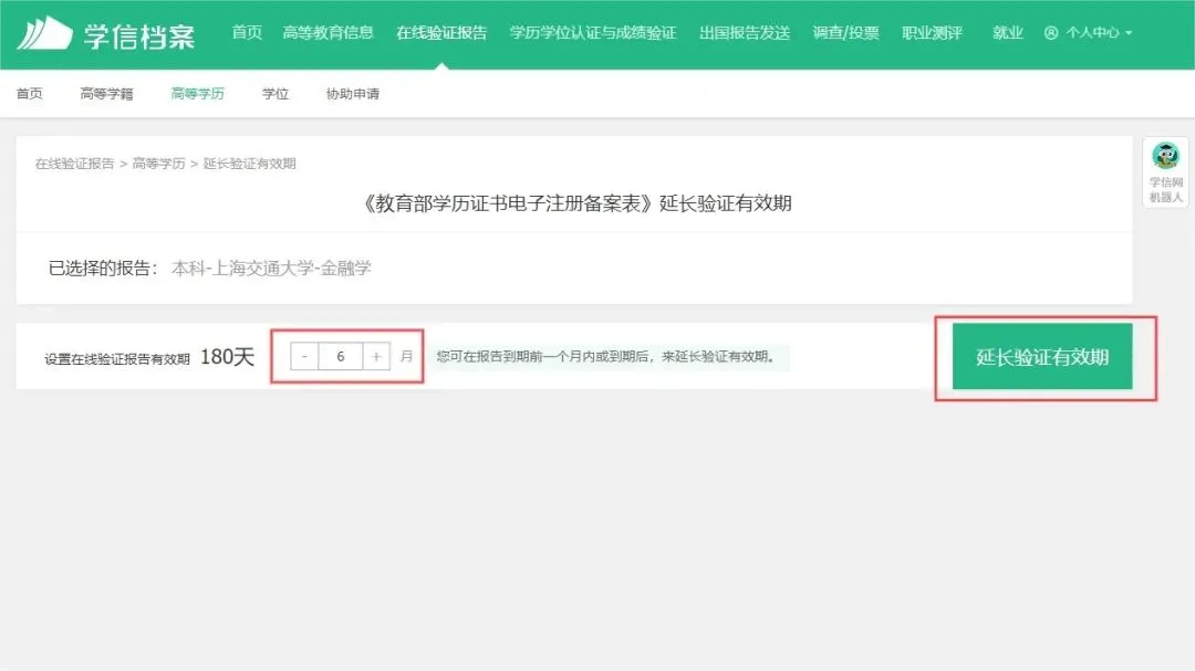 可以设置延长报告时间,一般选择180天,点击延长验证有效期。
