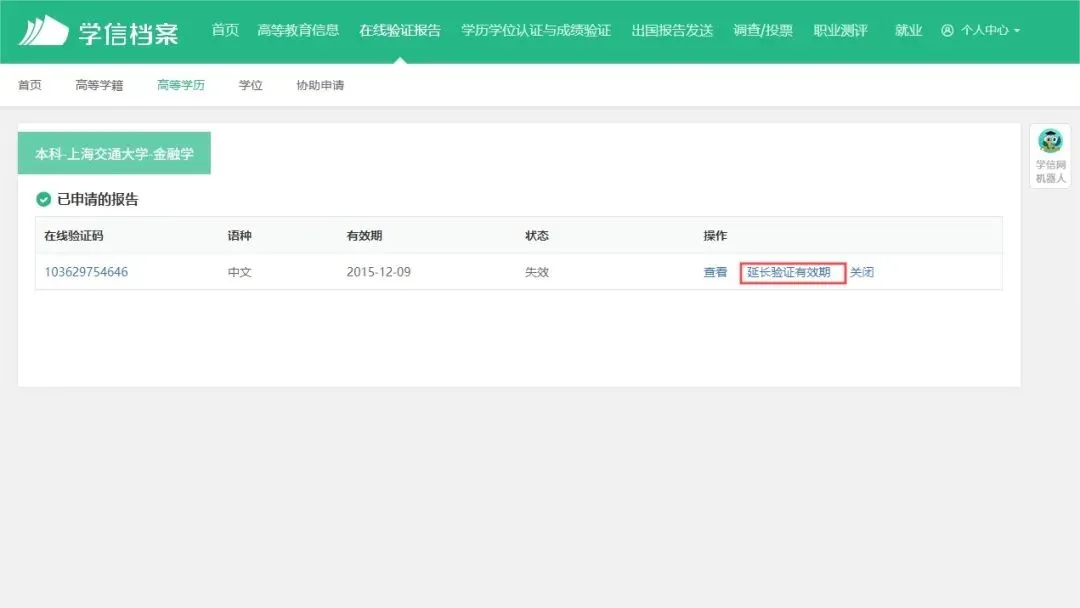第五步:如申请报告记录已过期,点击延长验证有效期即可