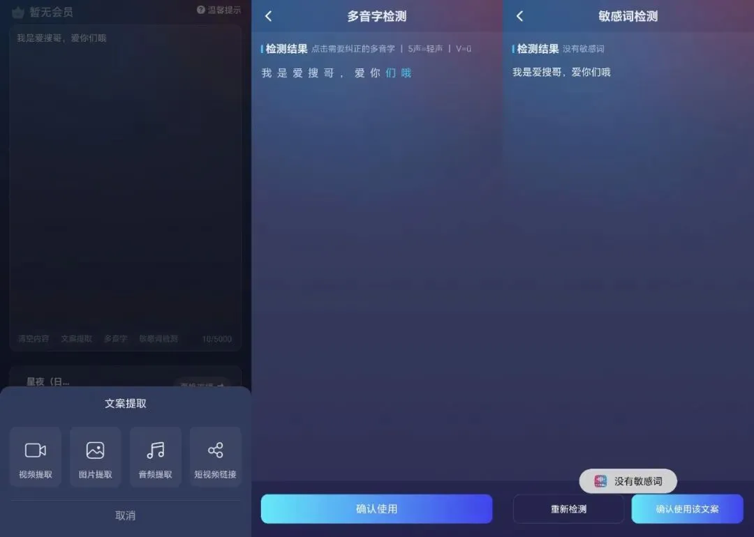 软件打开之后,我们需要手机号进行登录,然后就可以享受尊贵的会员服务了,我们可以选择视频、图片、音频提取文案,也可以选择手动输入,另外,多音字监测、敏感词监测也是很给力。软件内的配音员非常的丰富多样、还进行了非常详细的分类。无论你是上班族还是学生,又或者是摆摊还是做大老板的,都可以在里面找到合适你的配音员。软件不仅可以让你生成非常优秀的配音,还提供了海量的音频,可以作为你的背景音乐,同时也可以使用本地的音频一键添加到配音里面,另外,配音的声调、语速等都可以自行调节。除了配音功能,软件还有许多自媒体功能,像是格式转换、音频拼接、音频变声等,很多都是经常会使用到的功能。这个软件呆在我手机里面至少三年了,真的值得大家收藏。今天的软件是不是大部分人都会用到的呀!是不是很棒呢?如果觉得软件不错就分享给小伙伴,同时要记得给可爱辛苦的爱搜哥点个在看和充满爱的赞喔。