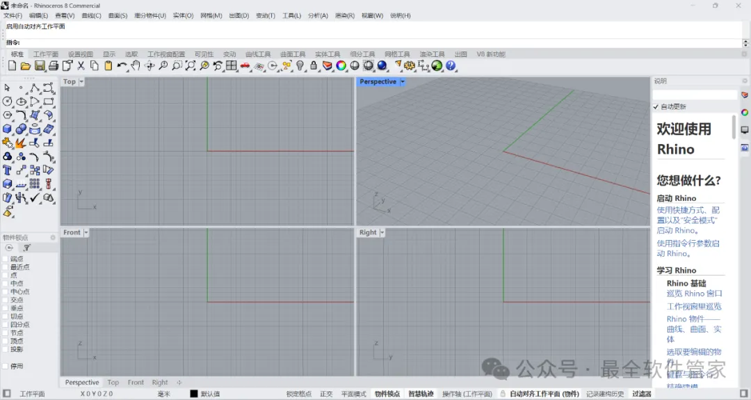 Rhino 8.3中文名为“犀牛软件”,是一款高级建模软件,拥有着强大的 3D 建模设计功能,可以为您提供创建模型、编辑、分析、渲染、动画设计与转换 NURBS线条、曲面、实体与多边形网格等等全套的模型设计。Rhinoceros 可以让您不受限制的自由设计三维模型,模拟设计出任何你能想象到的形状。