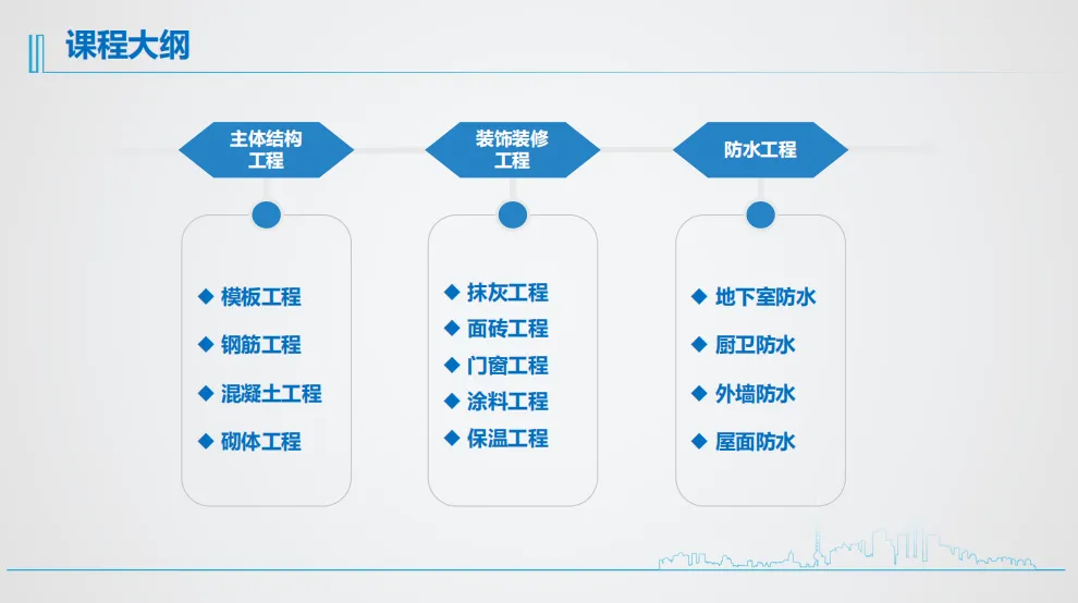 模板工程 钢筋工程 混凝土工程 砌体工程 | 抹灰工程 面砖工程 门窗工程 涂料工程 保温工程 | 地下室防水 厨卫防水 外墙防水 屋面防水 |