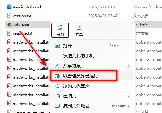 2024版和2025版本安装步骤基本相同,大家参考即可,密钥已做修正 1、鼠标右键解压到“Matlab 2025 a” ![]() 2、双击打开“R2025a_Windows” ![]() 3、选中setup,鼠标右键选择“以管理员身份运行” ![]() 4、点击高级选项,选择“我有文件安装密钥” ![]() 5、选择是,点击“下一步” ![]() 6、在输入文件安装密钥输入: 21471-07182-41807-00726-32378-34241-61866-60308-44209-03650-51035-48216-24734-36781-57695-35731-64525-44540-57877-31100-06573-50736-60034-42697-39512-63953点击“下一步” ![]() 7、点击“浏览”,下载解压后的文件夹Matlab 2025a文件夹中的【Crack】文件夹,选中license.lic文件,点击“打开” ![]() 8、点击“下一步” ![]() 9、选择软件安装路径,点击“下一步” ![]() 10、点击“下一步” ![]() 11.勾选将快捷方式添加到桌面,点击“下一步” ![]() 12、点击“开始安装” ![]() 13、软件正在安装,请耐心等待 ![]() 14、点击“关闭” ![]() 15、双击打开【Crack】文件夹 ![]() 16、复制【bin】文件夹 ![]() 16、将bin文件夹粘贴到软件安装路径下(第10步设置的路径),点击“替换目标中的文件” ![]() 17、双击图标,运行软件 ![]() 18、安装结束 ![]() |