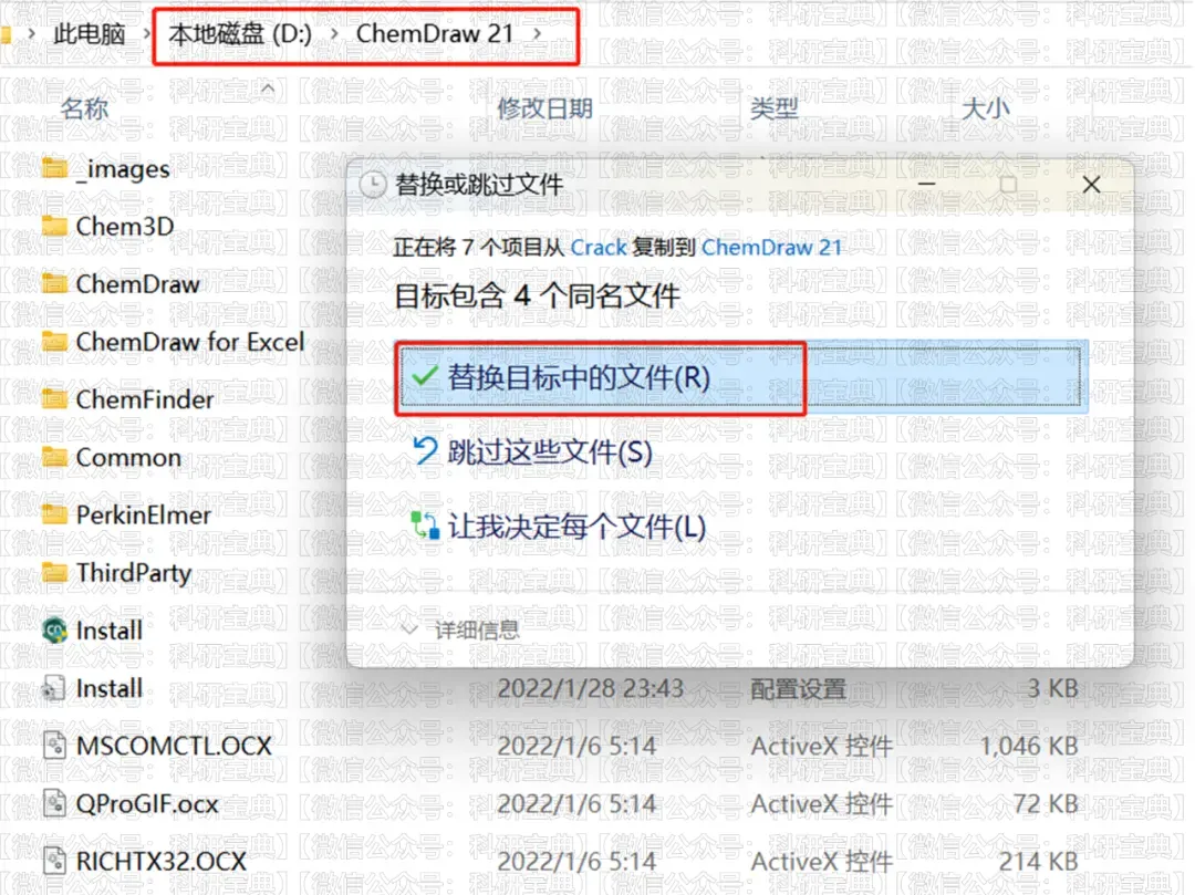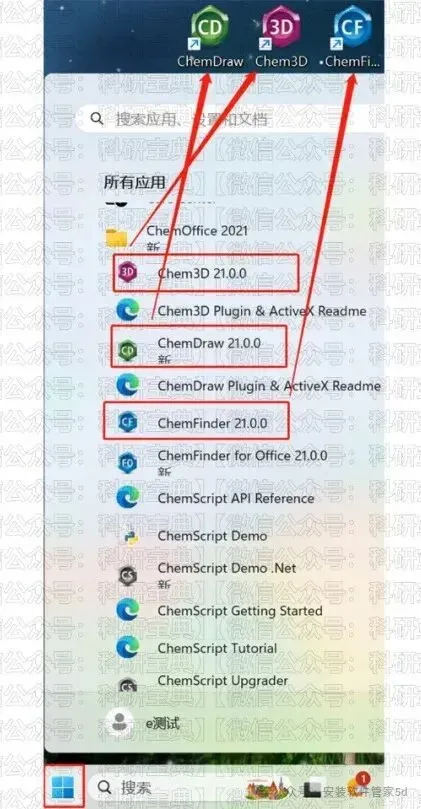 14.返回文件夹ChemDraw 20,将crack文件夹下的Chem3D、ChemDraw、ChemFinder分别复制到步骤9选择的源程序安装目录下。(如果之前是默认安装地址就选默认的地址,如果是自选更改的就选更改后的地址),然后“替换目标中的文件”15.创建桌面启动快捷方式:点击桌面左下角“开始”图标,点击“所有应用”,找到并拖动“ChemDraw 20”、“Chem3D”“ChemFinder ”图标到电脑桌面。