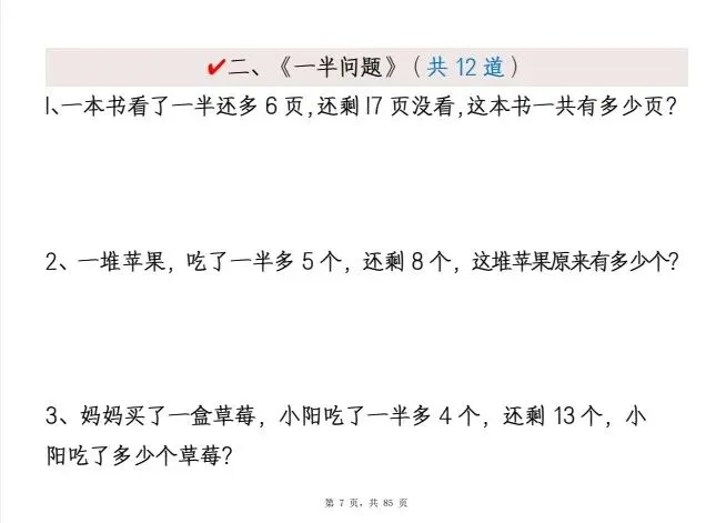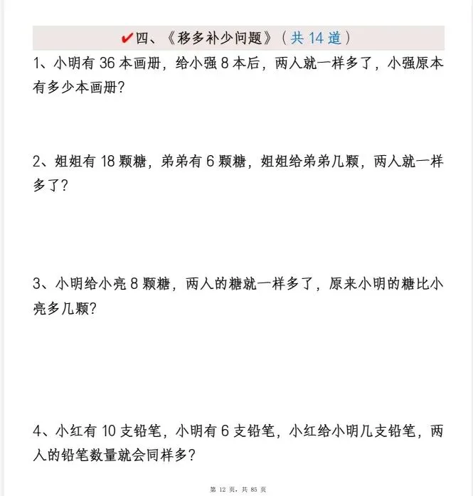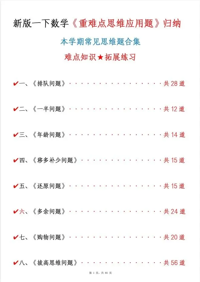 今天给大家整理了新一下数学《重难点思维应用题》八大类常见思维题归纳合集(含答案85页),转发给朋友或班级群,受益更多人,帮助孩子学习!