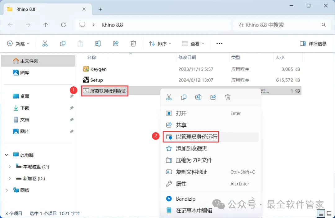 10、回到Rhino 8.8文件夹,找到【Keygen】程序,右键选择【以管理员身份运行】它