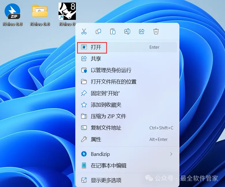 14、回到桌面,右键桌面上的【Rhino 8软件图标】,点击【打开】