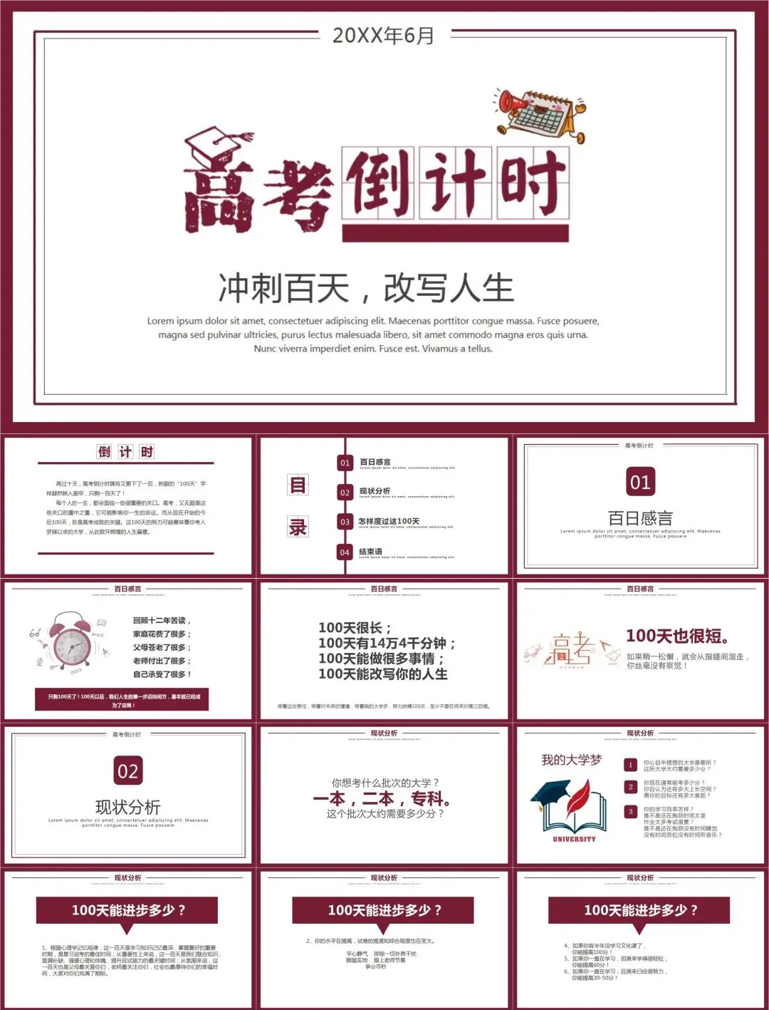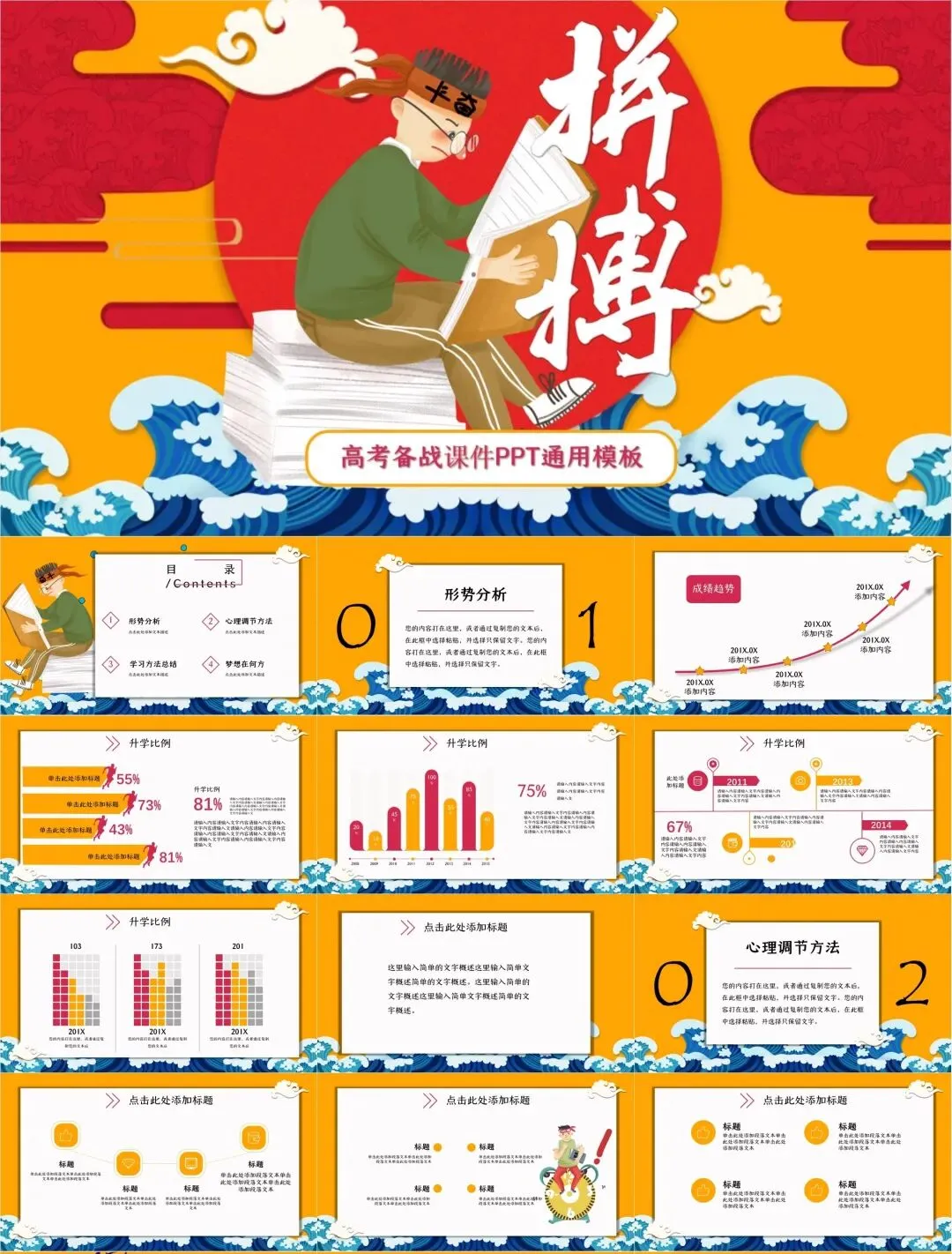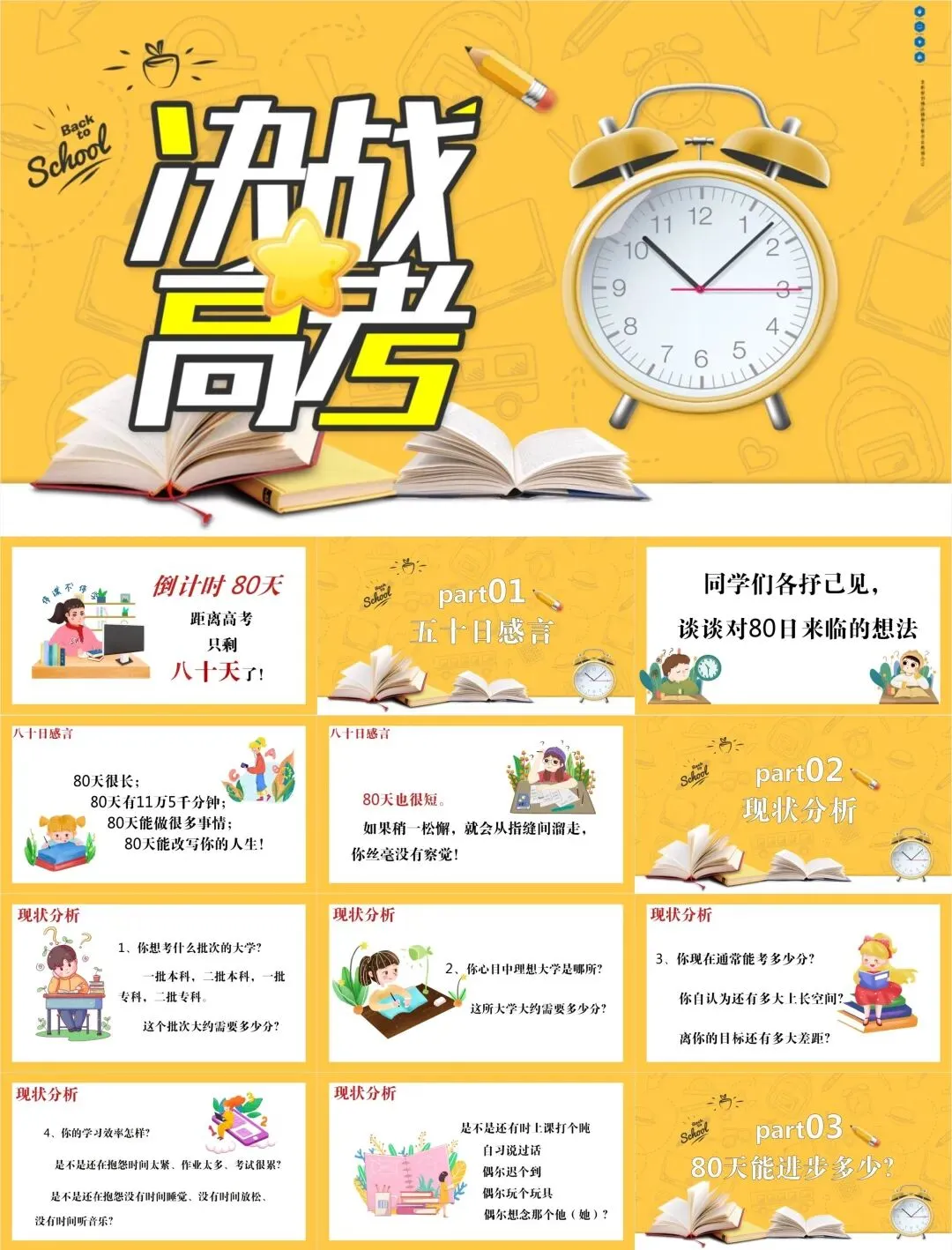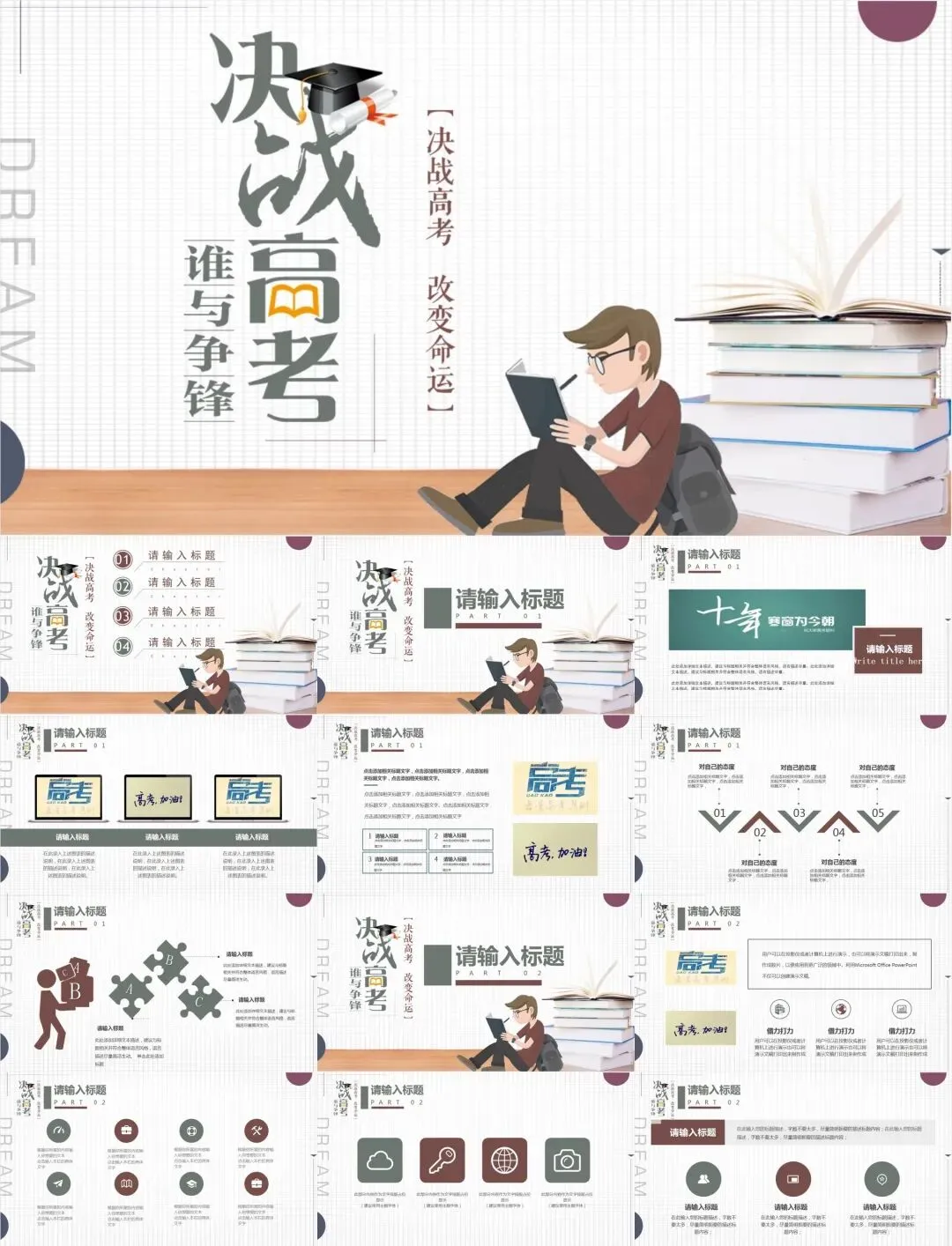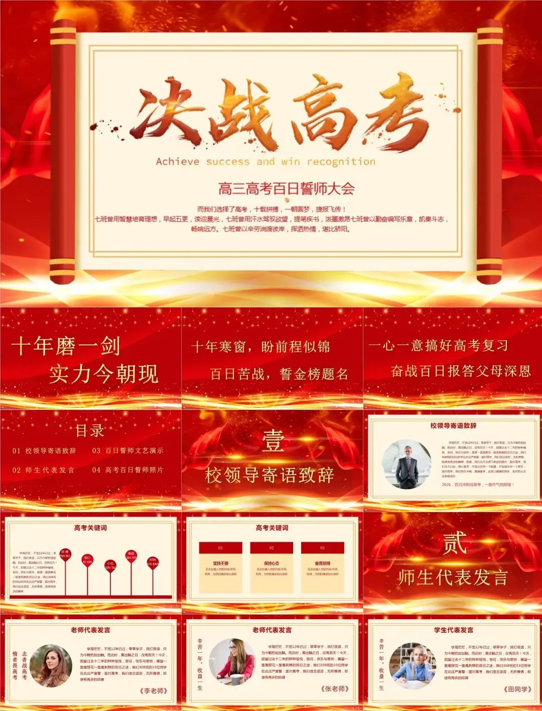 从百日誓师到考前指导,从心理调适到志愿填报,这套【高考全周期PPT智库】用66种热血设计,将备考智慧转化为视觉动力——您的每一次演示,都在为学子们注入决胜考场的勇气。