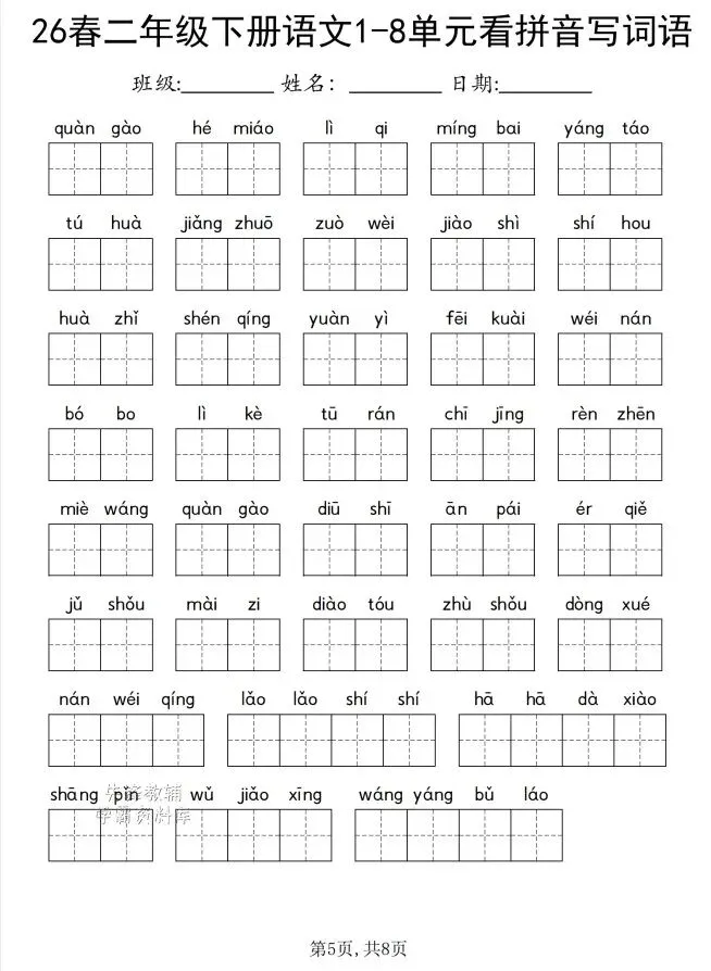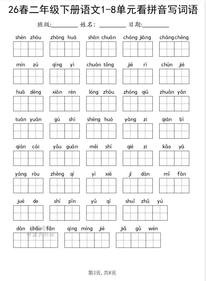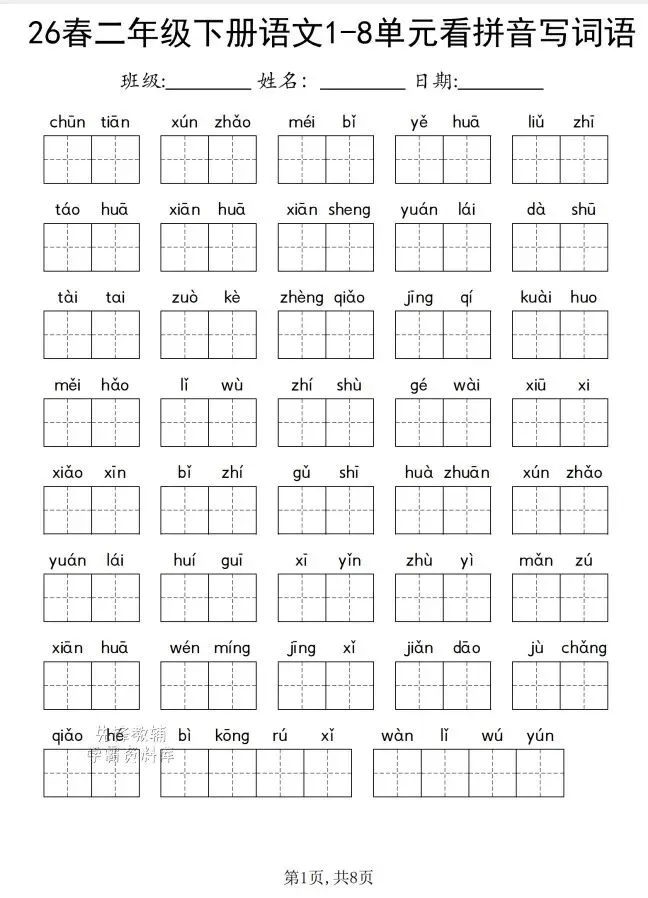 今天给大家整理了26春二年级语文下册1-8单元看拼音写词语,转发给朋友或班级群,受益更多人,帮助孩子学习!
