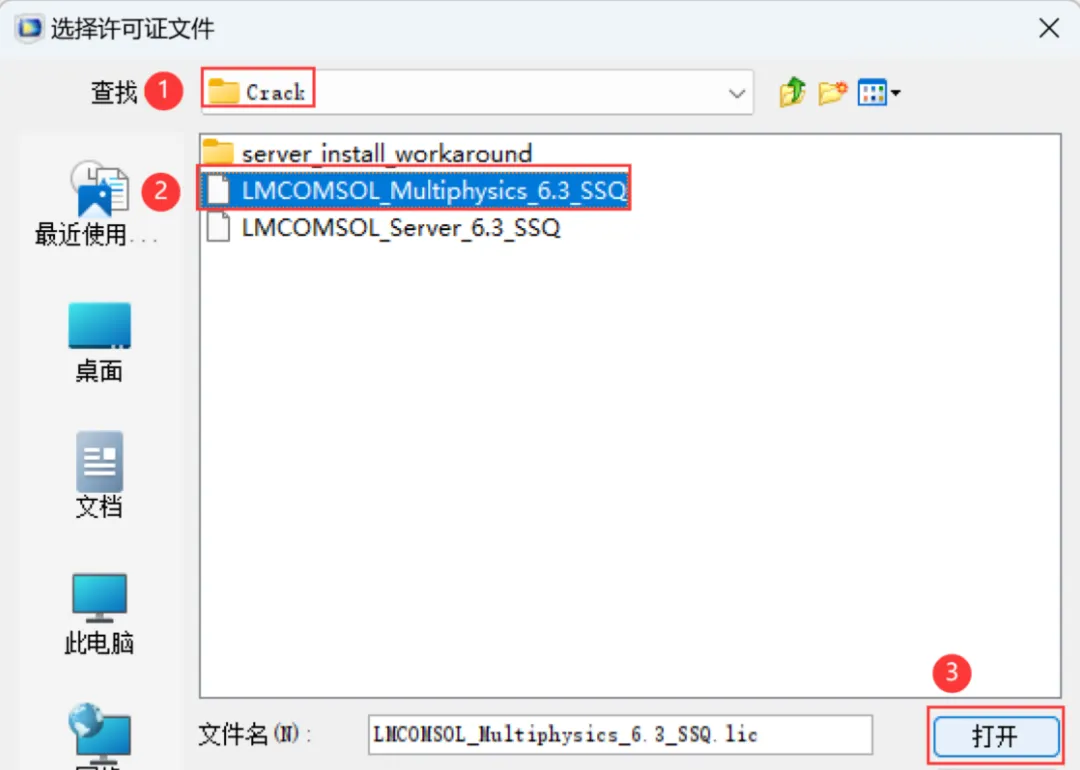 7、找到并选中安装包Crack文件夹下的【LMCOMSOL_ Multiphysics_6.3】文件,再点击【打开】