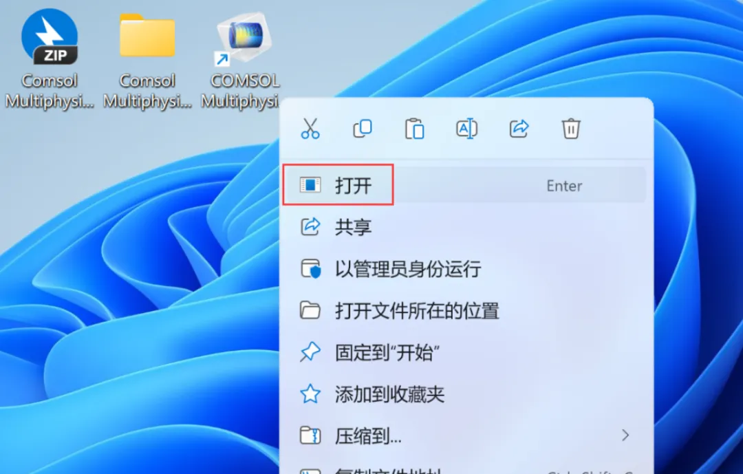 15、回到桌面,右键桌面上的【Comsol Multiphysics 6.3软件图标】,点击【打开】