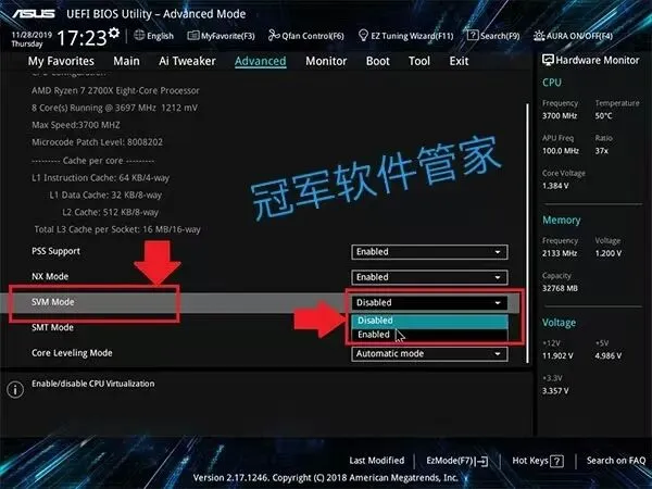 注:如果您的电脑处理器為 AMD CPU,进入BIOS页面后,同样在CPU设定(CPU Configuration)中找到“Secure Virtual Machine”/“SVM mode”这个选项,把“Disabled/关闭”改为 “Enabled/开启”,最后按下F10,保存退出即可。