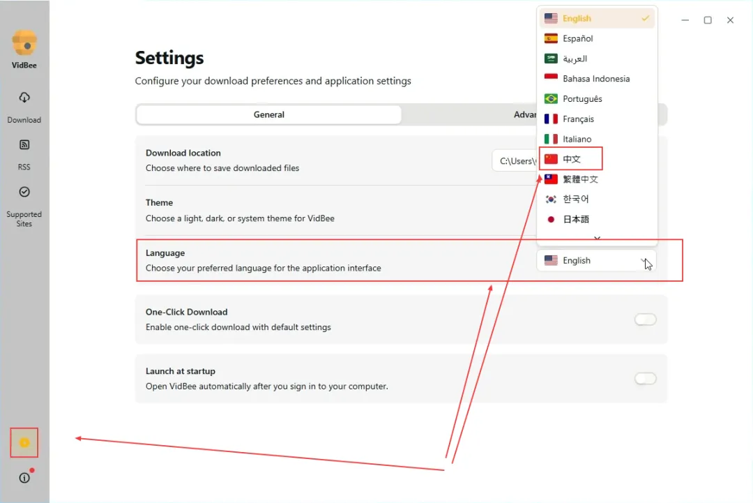 点击左下方的小齿轮——点击Language右侧的选择款,选择【中文】即可。