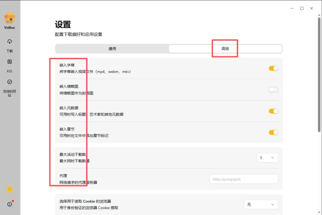 在【高级】设置里面,有更多的关于下载视频的设置,如:视频字幕、缩略图及章节等。