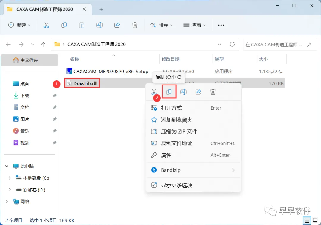 9、回到CAXA CAM数控车 2020文件夹,找到【DrawLib.dll】文件,再右键点击【复制按钮】