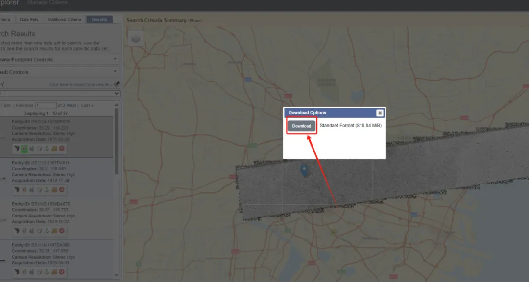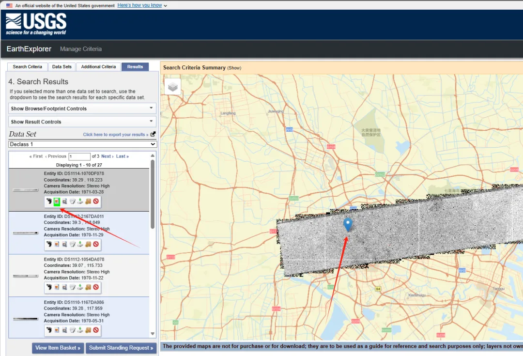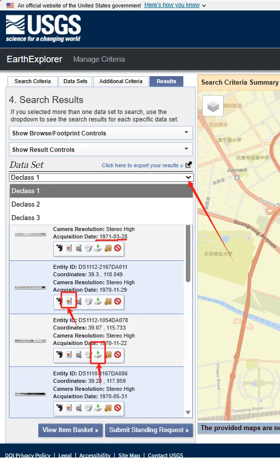 第二,搜索完后就会有不同时期的卫星图啦。选择不同的“Declass”就可以下载不同年代的卫星图啦。