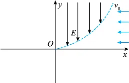 题目二、如图所示,沿y轴负方向的匀强电场,y轴为匀强电场的左边界;大量质量为m、带电荷量为+q(q>0)的粒子从+y轴上不同位置、沿x轴正方向以初速度v0(大小未知)射入匀强电场。求这些粒子聚焦于同一点应满足的条件?