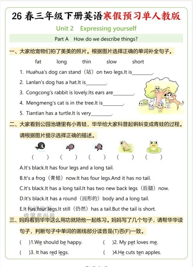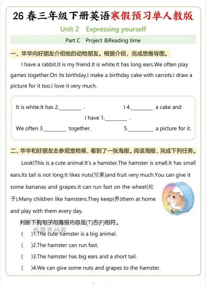今天给大家整理了26年春三年级下册英语寒假第二单元同步预习单《人教版》,转发给朋友或班级群,受益更多人,帮助孩子学习!
