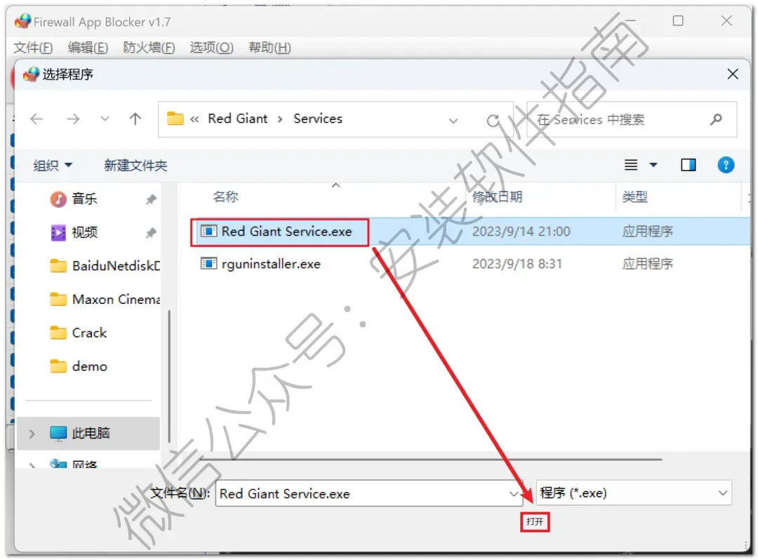 24、找到“C:\Program Files\Red Giant\Services”路径里的“Red Giant Service”文件,点击“打开”