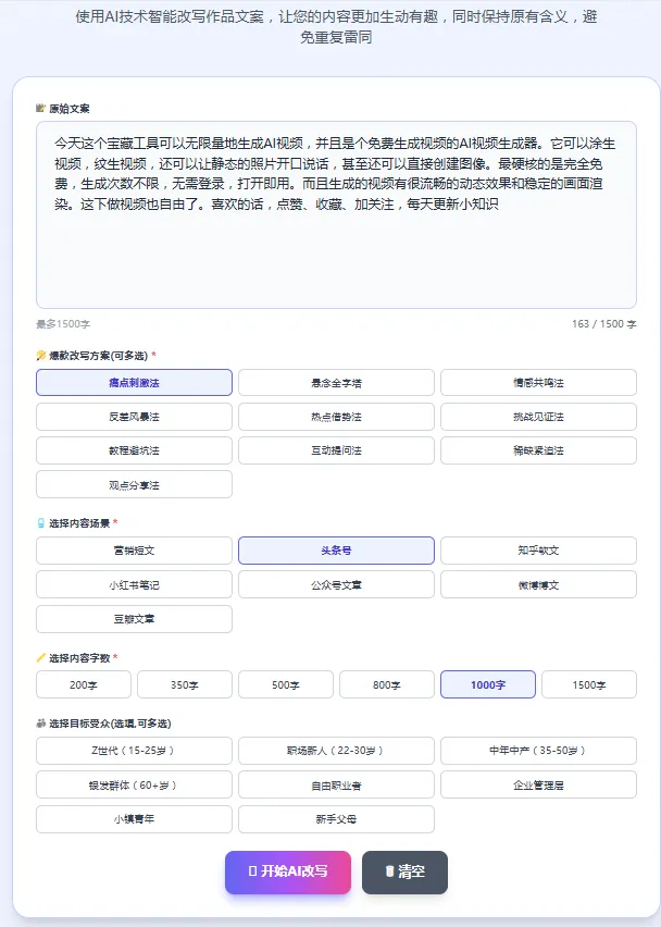 工具支持抖音、快手、小红书等50+平台的视频文案提取以及智能去水印。只需要粘贴平台视频链接,就帮你提取出了视频、音频、视频文案以及视频封面。文案改写功能,可以设定改写方案特点、针对公众号、头条号等内容场景特点,一键进行文案改写。支持小红书图文作品链接解析,自动识别图片中的文字内容,快速提取文案,支持批量下载图片。