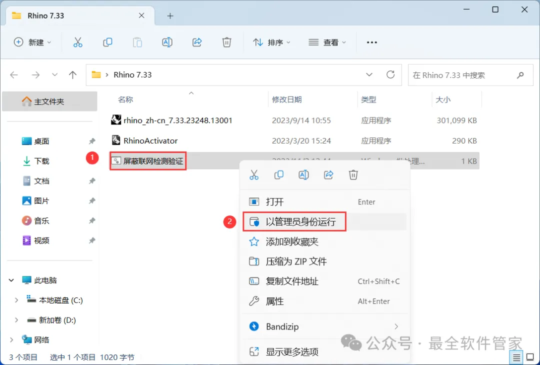 8、回到Rhino 7.33文件夹,找到【屏蔽联网检测验证】程序,右键选择【以管理员身份运行】它