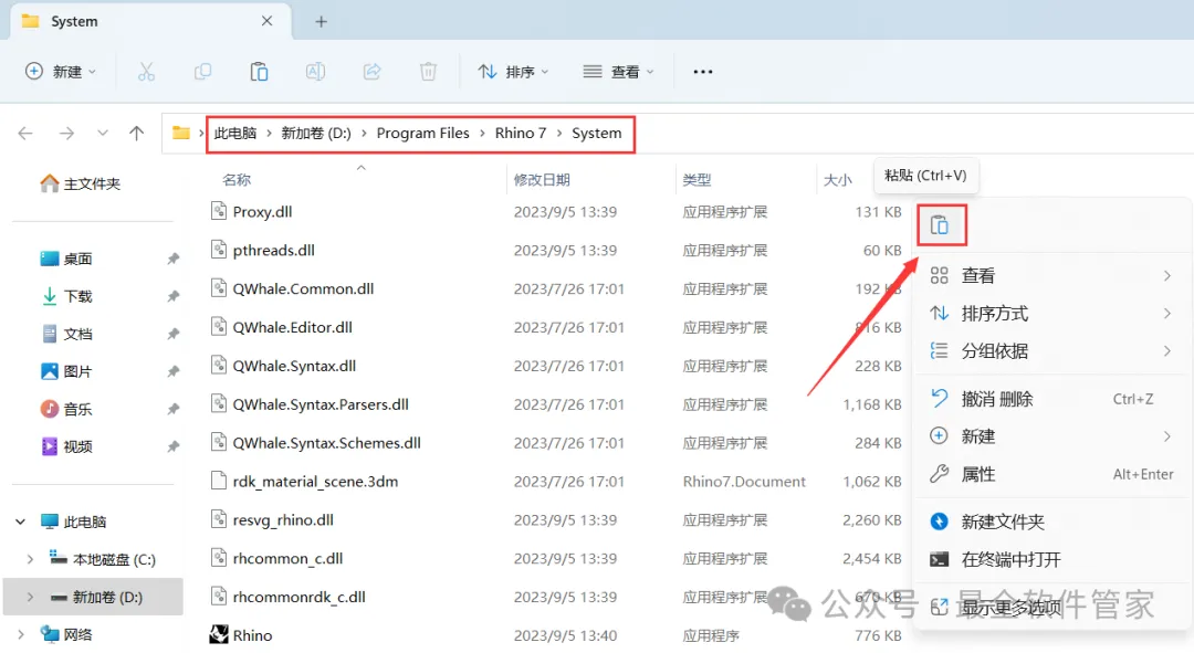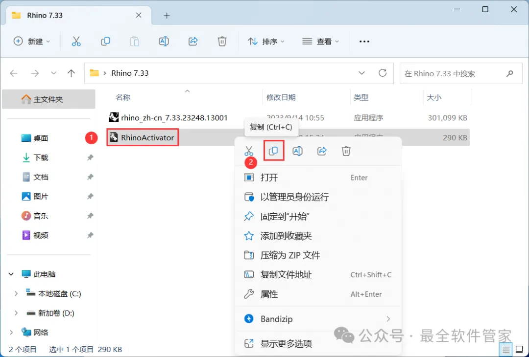 10、回到Rhino 7.33文件夹,找到【RhinoActivator】程序,再右键点击【复制按钮】