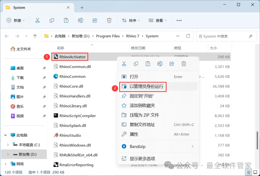 13、找到粘贴的【RhinoActivator】程序,再右键选择【以管理员身份运行】它