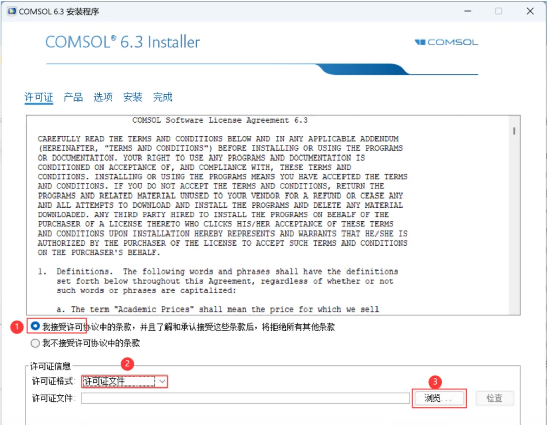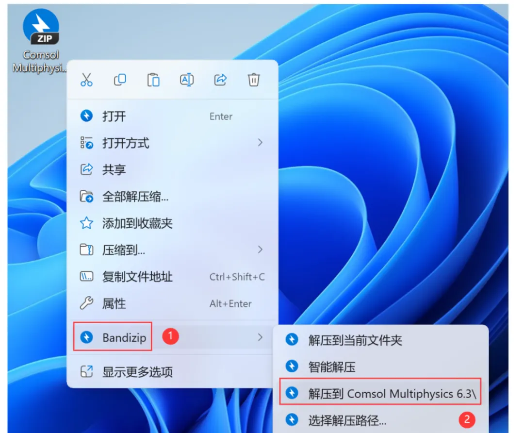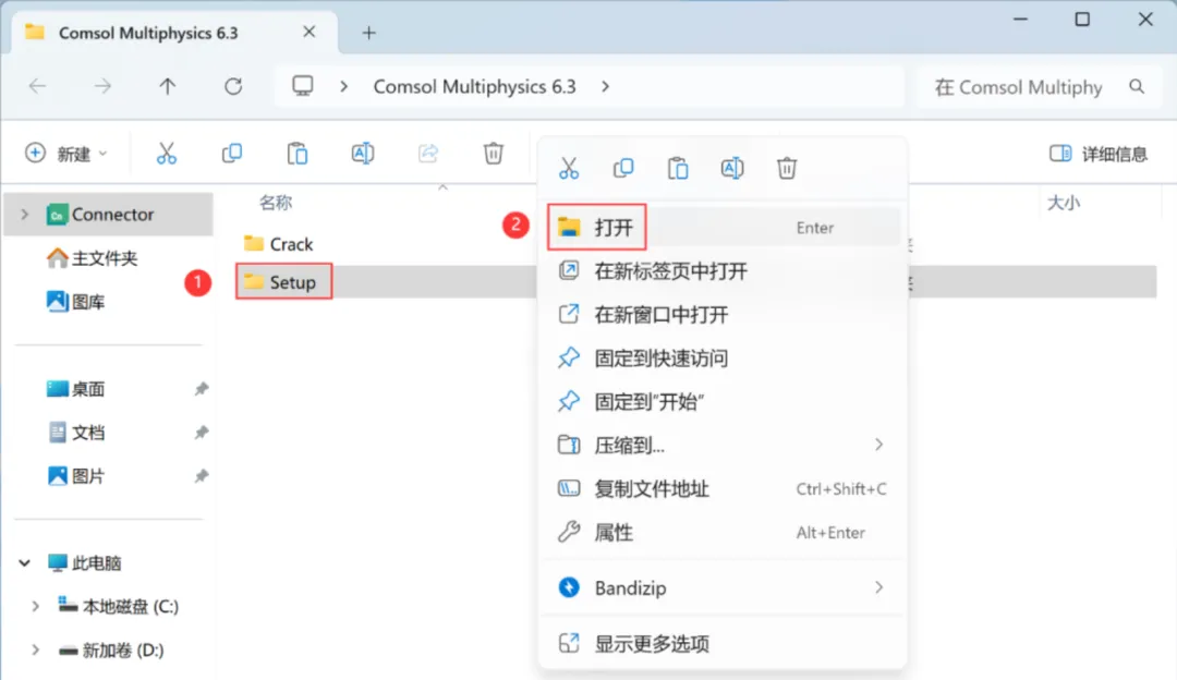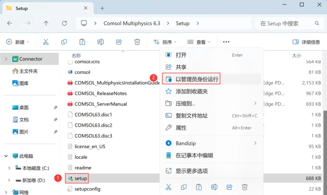 1、下载Comsol Multiphysics 6.3软件安装包到电脑上,右键选择【解压到Comsol Multiphysics 6.3\】 2、右键【打开】解压后的文件夹 3、找到【Setup】文件夹,右键【打开】它 4、找到【setup】应用程序,右键选择【以管理员身份运行】它 5、点击【新安装COMSOL 6.3】 6、勾选【我接受】,许可格式选择【许可证文件】,再点击【浏览】 7、找到并选中安装包Crack文件夹下的【LMCOMSOL_ Multiphysics_6.3】文件,再点击【打开】 8、点击【下一步】 9、软件默认安装在C盘,可自定义更改软件安装位置,这里小编选择安装在D盘;点击【下一步】 10、更新一栏两项都不勾选,再点击【下一步】 11、点击【下一步】 12、点击【安装】 13、软件安装中,稍等片刻 14、安装完成,点击【关闭】 15、回到桌面,右键桌面上的【Comsol Multiphysics 6.3软件图标】,点击【打开】 16、软件正在打开,启动界面如下: 17、软件打开成功,运行界面如下: |