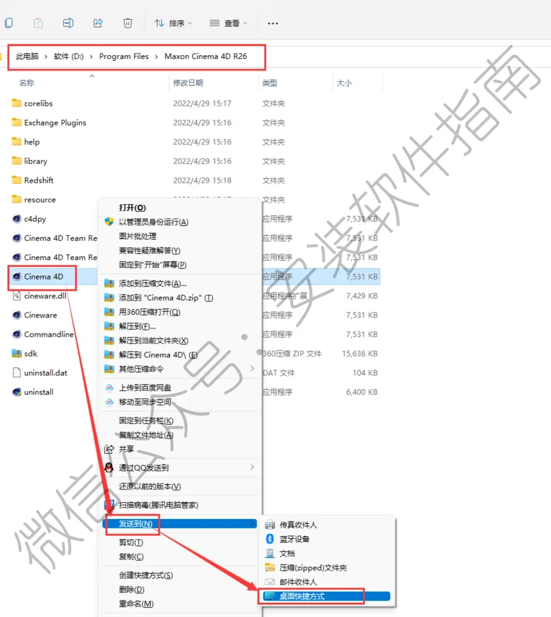 11、软件快捷方式图标不会自动出现在桌面,需要自己找出来。打开软件安装目录(就是第5步让您记住的安装位置),找到Cinema 4D图标,对着图标→鼠标右键→发送到→桌面快捷方式 即可!(也可以在开始菜单里查找到这个软件,直接拖拽到桌面上)