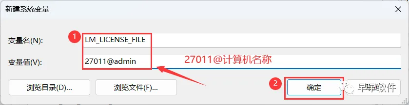 15、变量名输入:LM_LICENSE_FILE;变量值输入:27011@计算机名,再点击【确定】